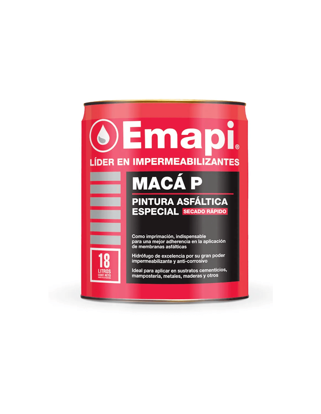 Un producto de aplicación en frío y de secado rápido, pensado para aplicar como imprimación o como impermeabilizante y anticorrosivo. La pintura Macá P está desarrollada sobre una base de asfaltos oxidados. Esto le otorga dos propiedades únicas: facilita y asegura la correcta adherencia entre las membranas asfálticas y sus sustratos de aplicación y protege contra la humedad gracias a que cuenta con propiedades hidrófugas y anticorrosivas. Posee una consistencia ideal para aplicar sobre múltiples superficies y otorga un poder de penetración óptimo.
